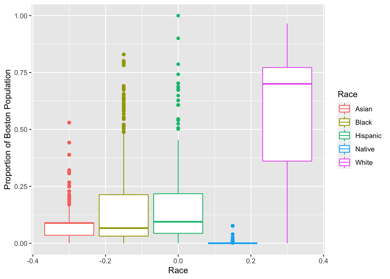 labs(x = "Race", y = "Proportion of Boston Population", color = "Race")